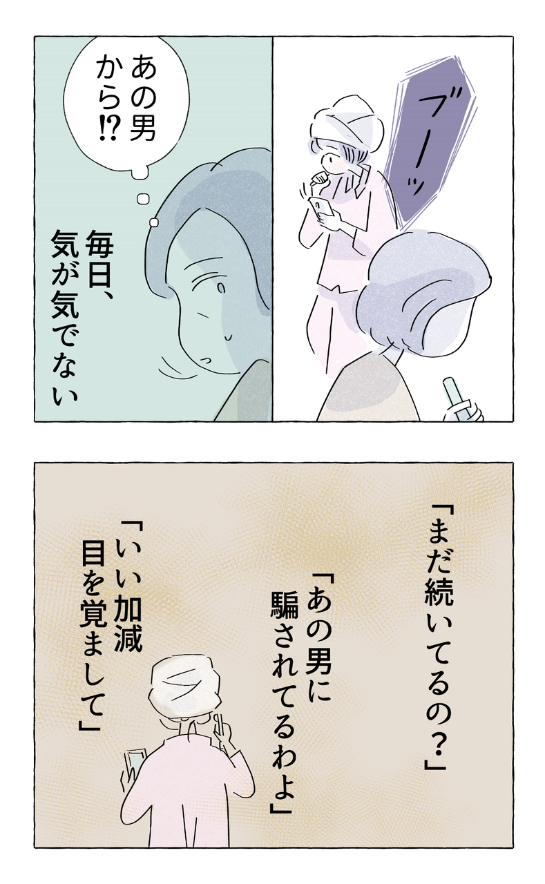 やさしさに溺れる・40 2022/08/19 はじめから読む前回のお話第40話次のお話👇👇👇読者登録はこちらから👇👇👇ライブドアブログがアプリで読めるようになりました!(アプリのインストールが必要です)画像をクリックしていただけると福々ちえのフォローページに飛びます。ぜひ読者登録お願いいたします^^////// 完結WEBコミック //////【セミフィクション】スパイスカレーで気合いを入れ奮闘する女達【35話/続編準備中】【セミフィクション】優しさがすぎて過保護気味な母の愛が暴走する【全86話】【セミフィクション】頑張っているのに報われない💢仕事ができる女の恋【全11話】【エッセイ】夢に生きるか?現実に生きるか?の分かれ道【全22話】【エッセイ】家族みんなの幸せ目指して戦います【全13話】【著書紹介】↓↓↓試し読みはこちらから↓↓↓ 「コミック」カテゴリの最新記事 タグ :#ふくふくちえ#自己紹介#福々ちえ < 前の記事次の記事 > コメント コメント一覧 (2) 1. ? 2022/08/19 11:50 浮気を疑うのと同じで、スマホ覗くまでに至っている時点で自分にとっていい結果なんて絶対ないのよね。 一旦客観的に踏みとどまれたお母さんに拍手です。。 葛藤もわかるけど、娘以外に熱中できるものがあったらここまでは苦しくならなかったかもね。 娘さんが自分の選択で沢山の経験をし、彩りある人生になりますようにい。 0 福々ちえ がしました 2. ななし 2022/08/20 22:20 私も学生時代ろくでもない男と付き合って母から散々忠告された経験があるので、まるで昔の自分を見ているようです… 交際年数が経つにつれ彼の異常性に気づき、別れたいと思うようになりましたが、散々母の忠告を無視してきたのに今更別れるなんてそんな自分勝手なことが許されるのか?となかなか別れられずにいました。 けれど母はいつも「学生時代のお付き合いなんて別れて当たり前」「いつでも戻ってきなさい(両親の反対を押し切り同棲してました)」と言ってくれていたので、母の愛に甘える形で彼と別れることにしました。 自分語りとなりましたが、正直”恋は盲目”状態になってしまうと痛い目を見るまで目は覚めません… 目が覚めたあと、私には帰る場所があると思えるような言葉がけをしていくことが大事なのかなと思います。 今は幸せです。 0 福々ちえ がしました コメントフォーム 名前 コメント 記事の評価 リセット リセット 顔 星 情報を記憶 コメントを投稿する