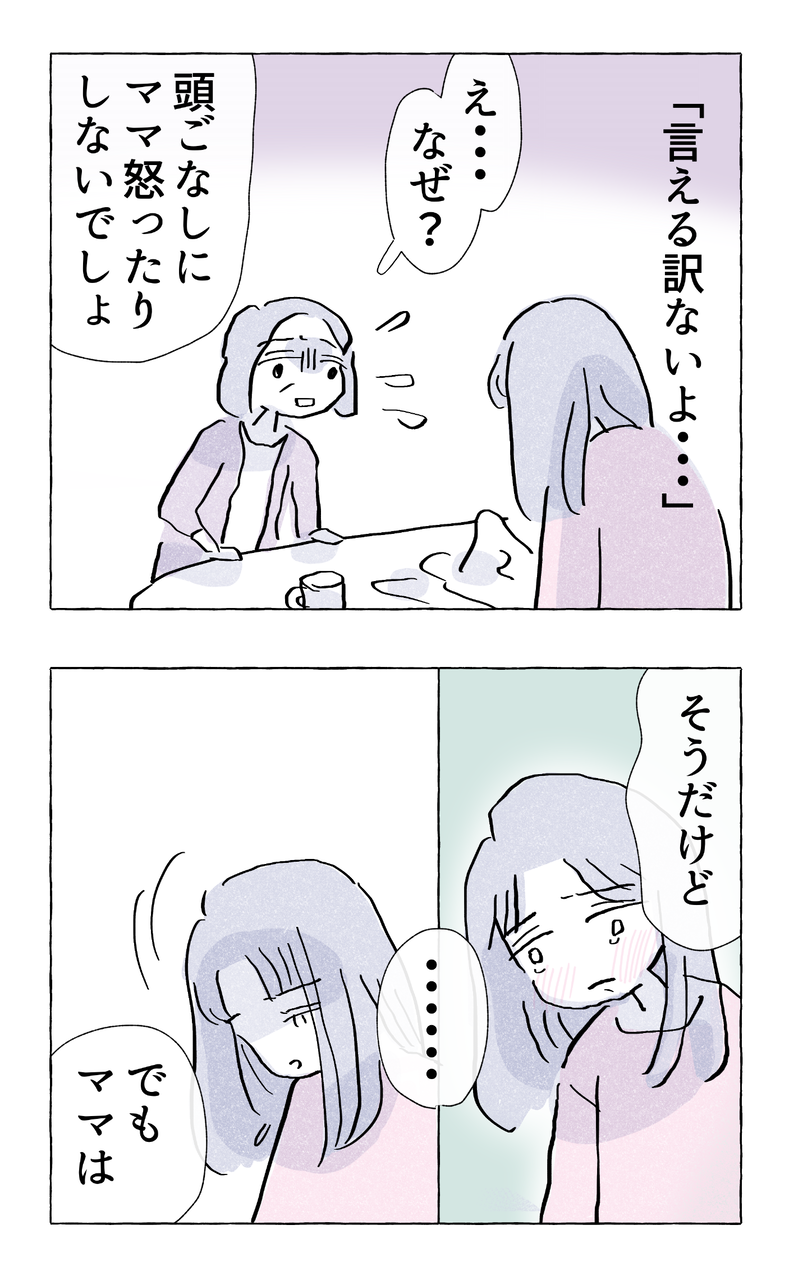 やさしさに溺れる・51 2022/09/01 はじめから読む前回のお話第51話次のお話👇👇👇読者登録はこちらから👇👇👇ライブドアブログがアプリで読めるようになりました!(アプリのインストールが必要です)画像をクリックしていただけると福々ちえのフォローページに飛びます。ぜひ読者登録お願いいたします^^////// 完結WEBコミック //////【セミフィクション】スパイスカレーで気合いを入れ奮闘する女達【35話/続編準備中】【セミフィクション】優しさがすぎて過保護気味な母の愛が暴走する【全86話】【セミフィクション】頑張っているのに報われない💢仕事ができる女の恋【全11話】【エッセイ】夢に生きるか?現実に生きるか?の分かれ道【全22話】【エッセイ】家族みんなの幸せ目指して戦います【全13話】【著書紹介】↓↓↓試し読みはこちらから↓↓↓ 「コミック」カテゴリの最新記事 タグ :#ふくふくちえ#自己紹介#福々ちえ < 前の記事次の記事 > コメント コメント一覧 (20) 1. @ 2022/09/01 17:18 親はいつだって子どもの幸せを願ってるっていうけど、子どもだって同じくらい親の幸せを願ってるよね。 自分の容姿のことでいじめられるより、親のことで色々言われる方が何倍も辛い。 私の親は介護を経験したことないまま祖父母が他界してしまったけど、介護してる親を見たら尚更そう思うよね。 0 福々ちえ がしました 2. なつ 2022/09/01 21:22 男のせいで女性たちが不幸になってる 0 福々ちえ がしました 3. 堀 2022/09/01 21:43 ほらみろ 怒らないなんてすげーできた母親 今回だって男があの一瞬の面談でわかるようなクズだったら(ヤクザだってチンピラだっているんだぞ)心配のあまり正当に興信所行くだろ 娘が引っ込み思案すぎ 男にも好みすら言えないで我慢して 出来ない自分を全て親のせいにする 本来の性格だよ 親、大学にも行けない自分を励まして 介護して育児して頑張ってきたでしょ これ以上娘からも責められるの? ありえないわ 0 福々ちえ がしました 7. 岡 2022/09/02 08:11 >>3 母親の意見としてとても参考になります! 子ども側の意見ものせておきますね。 「出来ない自分を親のせいにする理由」は、なんでもできてしまう親だったために、そこに成長する隙を与えてくれなかった。そのため、子どもが成長しきれなかったという考え方です。 あえて、出来ないふりをして子どもに手伝ってもらう。子どもとしては大切な親を少しでも手助けすることができた!という自信につながり、引っ込み思案という性格も変わっていたのではないかと思うのです。 私自身がそうでした。完璧にできてしまう両親だったため、親の考える正解を基準におどおどしながら幼少期を過ごし、大人になった今でもパートナーの意向をなるべく汲んで過ごしてしまう癖がついてしまいました…。周りや親からは「気を遣いすぎ、もっと我を出せばいいのに」と言われますが、私としてはそういう性格にさせたのは親でしょ!?と思うのです。 そのため、そういう生い立ちから仕事では教育の現場に立ち、「あえて子どもに頼ってみる」という姿勢で取り組んでいます。 0 福々ちえ がしました 14. 堀 2022/09/03 12:09 >>7 まさかの返信が来て驚きです! 正直、娘側のような人生でした。 先回りされ心配され、 やりたいことを否定され、 自分の意思をもっと主張したかったです。 なかなか難しい親でした。 ただ、やめなさいと言われ 止めるようならそれは 本当にやりたいことか?と (私も気持ちは落ちましたがわかります) しかも、怒らない 介護、育児、夫は非協力 親は学びたい娘を殴る親 全てを見ているなら、 私は親の努力も受け入れ、 何もかも親のせいにしません。 なので熱くなりました。 私は親になったばかりです。 娘、親、両方に感情移入しました。 現時点では娘に激励したい気持ちで いっぱいです。 親は十分頑張ったと、肉親であれば 寄り添いたいです。 0 福々ちえ がしました 9. すみ 2022/09/02 12:15 >>3 別に責めているわけではなくて、 負担になりたくないって 思うのは自然なことだと思います。 それって純粋に愛から成り立つ想いですよね。 親が余裕がなければ 子供は引っ込み思案というか、伝えたいことも我慢する性格にもなっちゃうのでは? 大好きだから『負担になりたくない』んだもの。 足りなかったのはお互いの『察する』を無くす努力。 コミュニケーションが足りないってだけ。 お互いを理解しようとする心はこの親子はちゃんとあるもの。 0 福々ちえ がしました 12. 岡 2022/09/03 09:18 >>9 お互いの「察する」を無くす努力になるほどと思いました! よく女性は男性に対して言動から「察して」を強要し、男性は「言ってくれないとわからない」という姿勢があるということをサイトや本などで目にします。また、会社でも気配りや察する能力が大事であるということも言われています。しかし、相手側のニーズ(ここでは娘さんへの傾聴や同調でしょうか)に合っていなければそれはただのお母さんの「お節介」になってしまいます。お