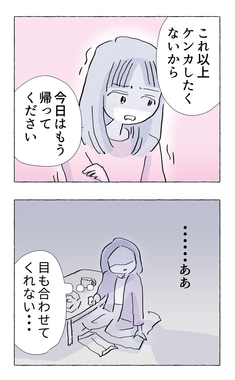 やさしさに溺れる・52 2022/09/02 はじめから読む前回のお話第52話次のお話👇👇👇読者登録はこちらから👇👇👇ライブドアブログがアプリで読めるようになりました!(アプリのインストールが必要です)画像をクリックしていただけると福々ちえのフォローページに飛びます。ぜひ読者登録お願いいたします^^////// 完結WEBコミック //////【セミフィクション】スパイスカレーで気合いを入れ奮闘する女達【35話/続編準備中】【セミフィクション】優しさがすぎて過保護気味な母の愛が暴走する【全86話】【セミフィクション】頑張っているのに報われない💢仕事ができる女の恋【全11話】【エッセイ】夢に生きるか?現実に生きるか?の分かれ道【全22話】【エッセイ】家族みんなの幸せ目指して戦います【全13話】【著書紹介】↓↓↓試し読みはこちらから↓↓↓ 「コミック」カテゴリの最新記事 タグ :#ふくふくちえ#自己紹介#福々ちえ < 前の記事次の記事 > コメント コメント一覧 (4) 1. ゆ 2022/09/02 17:17 このお母さん、本当にバカだよね。 本当に私を思ってなんて思ってるんだろうか? 自分の許せる娘じゃない場合、全部母からすれば嘘つきなんでしょ?やる事やっといて、否定されたらクラッなんてイライラする。 娘ちゃんはもう一息かな。 お母さんを思ってっていうのは、喧嘩したくないからっていうのは、今まで通りの娘ちゃんの思考。母から否定されるのが怖いから、最後まで足掻ける限り「嘘でも」角の立たないようなお互いを守れる言葉を探すんだよね。 思いきって、否定も言えるようになりたいよね。じゃないと、お互い嘘しか言えない今までの親子のままだもんね。 0 福々ちえ がしました 2. なんかわかってきた。 2022/09/03 02:42 私と母みたいだ。たぶん母は悪い人じゃないけど、思ってることを言葉で話さなさすぎる。私はあなたが大切。それを思ってるだけで全て伝わるし、許されると、本当に思い込んでる。 0 福々ちえ がしました 3. 整理 2022/09/03 10:36 お母さんの幸せ=娘の幸せ(理想的なゴール:好条件の人と結婚して安定した仕事につくこと) 娘はお母さんが大好きだから、お母さんを悲しませたくない、できる限りお母さんの幸せを願いたいという思いやりがある。 そのため、娘の幸せ=[お母さんの幸せ=娘の幸せ(理想的なゴール:好条件の人と結婚して安定した仕事につくこと)] つまり娘は母の思う理想的なゴールをしなければって思うんだろうな…。心の中の葛藤や矛盾がおきて辛いね…。 だから、お母さんは娘の幸せを「理想的なゴール」ではなく「娘が自立すること」にかえる、理想的なゴールを期待しない。娘の性格が「思いやり>自分のやりたいこと」だとお母さんの「理想的なゴール」に沿ってしまって自分自身が辛くなってしまうから、「自分のやりたいことをやることが本当の親への思いやり」だと気付くことが大切ってことかな? 0 福々ちえ がしました 4. 堀 2022/09/03 12:25 こんなこといったら私の親からは 怒号浴びせられるし 帰ってとは何様だとか言われるなぁ 0 福々ちえ がしました コメントフォーム 名前 コメント 記事の評価 リセット リセット 顔 星 情報を記憶 コメントを投稿する