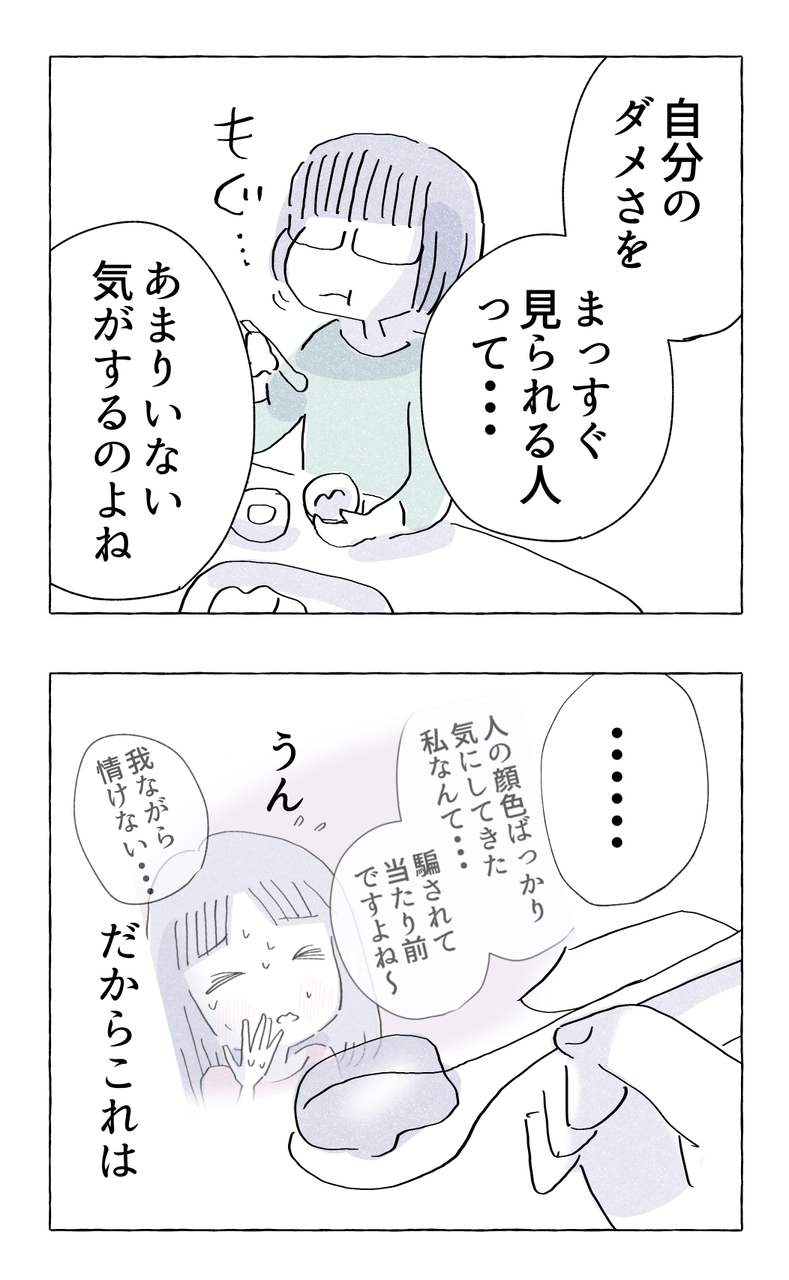 やさしさに溺れる・68 2022/09/28 はじめから読む前回のお話第68話次のお話 田端先輩と仲良くなったきっかけエピソードはこちら👇👇👇読者登録はこちらから👇👇👇ライブドアブログがアプリで読めるようになりました!(アプリのインストールが必要です)画像をクリックしていただけると福々ちえのフォローページに飛びます。ぜひ読者登録お願いいたします^^////// 完結WEBコミック //////【セミフィクション】スパイスカレーで気合いを入れ奮闘する女達【35話/続編準備中】【セミフィクション】優しさがすぎて過保護気味な母の愛が暴走する【全86話】【セミフィクション】頑張っているのに報われない💢仕事ができる女の恋【全11話】【エッセイ】夢に生きるか?現実に生きるか?の分かれ道【全22話】【エッセイ】家族みんなの幸せ目指して戦います【全13話】【著書紹介】↓↓↓試し読みはこちらから↓↓↓ 「コミック」カテゴリの最新記事 タグ :#ふくふくちえ#自己紹介#福々ちえ < 前の記事次の記事 > コメント コメント一覧 (3) 1. すみっこ 2022/09/28 16:31 読解なさすぎておめでとうの失敗がよくわからない…先輩説明してくれてるけど 0 福々ちえ がしました 2. あかり 2022/09/29 14:49 ヨイショじゃなく、この失敗があったから成長できるねって言ってくれる先輩優しい🥺✨ 0 福々ちえ がしました 3. むつ 2022/10/14 06:41 Twitterで流れてきてて、気になって一気に読んでしまいました。様々な視点で描かれているのが面白いです。主人公の視点だけだったらただの毒親も、親の視点で描いたら娘思いの凄く良い母親に読めるし、先輩も何を考えているか分からない嫌味な先輩に読めただろうけど先輩視点がある事で、過去に人に嫌われてきた経験があり女の子が苦手だけど、芯がしっかりあるって読めるし。人はちゃんと気持ちと想いがあって行動に出るのだなぁと。それを知るって大切なんだなぁと思いました。 0 福々ちえ がしました コメントフォーム 名前 コメント 記事の評価 リセット リセット 顔 星 情報を記憶 コメントを投稿する