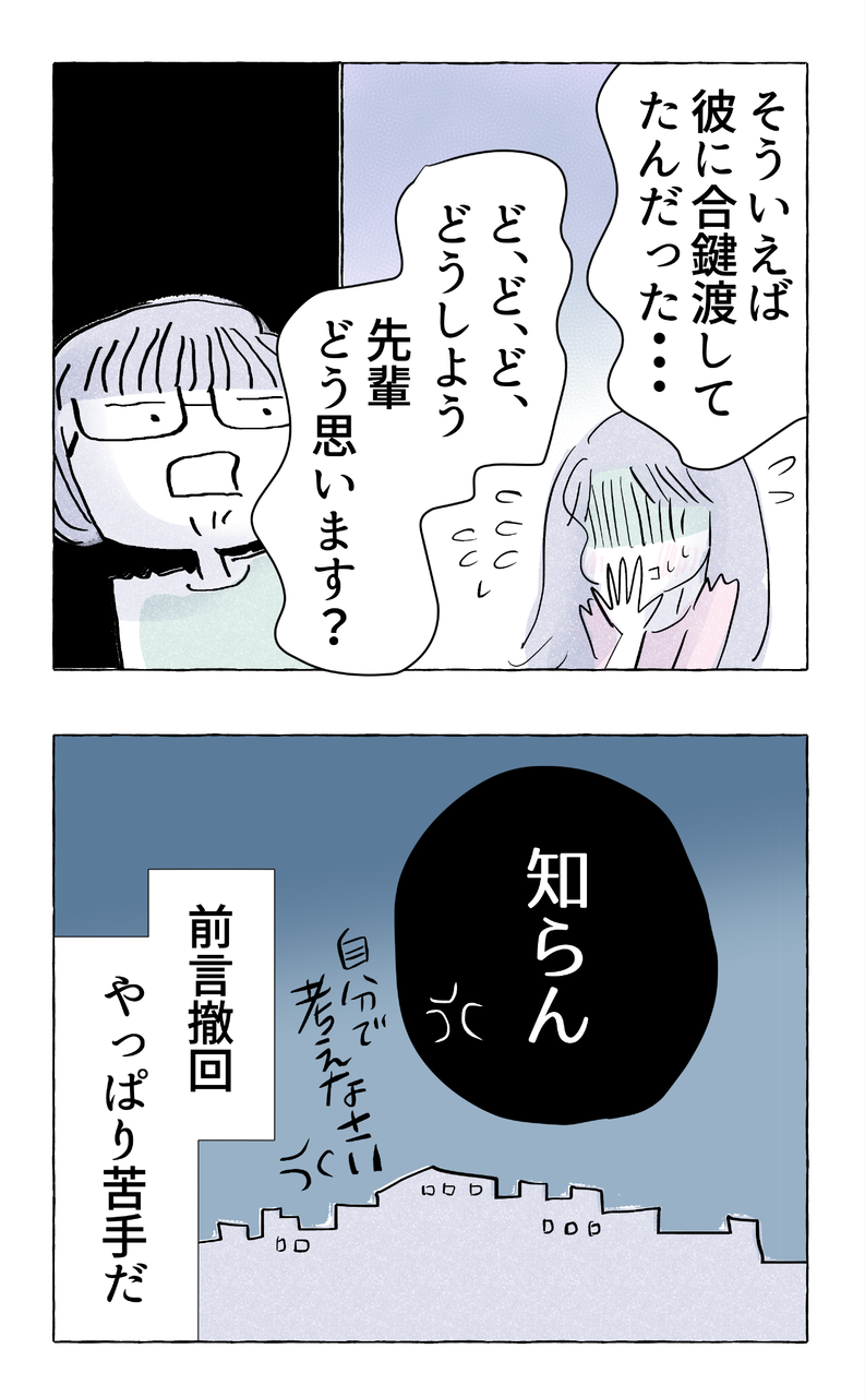やさしさに溺れる・70 2022/09/30 はじめから読む前回のお話第70話次のお話田端先輩と仲良くなったきっかけエピソードはこちら👇👇👇読者登録はこちらから👇👇👇ライブドアブログがアプリで読めるようになりました!(アプリのインストールが必要です)画像をクリックしていただけると福々ちえのフォローページに飛びます。ぜひ読者登録お願いいたします^^////// 完結WEBコミック //////【セミフィクション】スパイスカレーで気合いを入れ奮闘する女達【35話/続編準備中】【セミフィクション】優しさがすぎて過保護気味な母の愛が暴走する【全86話】【セミフィクション】頑張っているのに報われない💢仕事ができる女の恋【全11話】【エッセイ】夢に生きるか?現実に生きるか?の分かれ道【全22話】【エッセイ】家族みんなの幸せ目指して戦います【全13話】【著書紹介】↓↓↓試し読みはこちらから↓↓↓ 「コミック」カテゴリの最新記事 タグ :#ふくふくちえ#自己紹介#福々ちえ < 前の記事次の記事 > コメント コメント一覧 (3) 1. こういう場合 2022/09/30 20:31 やっぱり鍵変えた方が良いのかな? そこまでしなくても返してもらえばいいのか…でもなんか気持ち悪い。後でスペア作っていて部屋に入ってきたりしたら怖いな…。 0 福々ちえ がしました 2. うん 2022/09/30 21:42 >>1 絶対に変えた方がいいと思います! 0 福々ちえ がしました 3. 鍵は絶対変えるべき…! 2023/12/07 13:37 こんなふうに可愛い子って多分本当にいるんだよねぇ。自分がどちらかというと先輩のようなタイプだから、こういう可愛い真っ直ぐ育った優しい子、羨ましいなぁ。 0 福々ちえ がしました コメントフォーム 名前 コメント 記事の評価 リセット リセット 顔 星 情報を記憶 コメントを投稿する